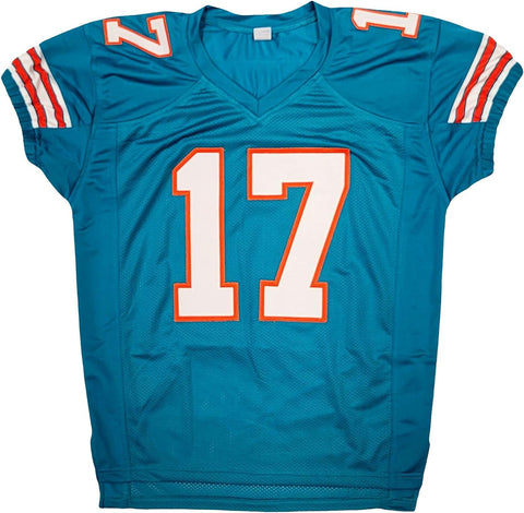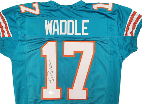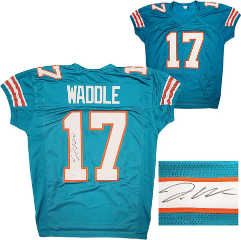 This is a Teal Pro Cut Jersey that has been hand signed by Jaylen Waddle. This is a custom jersey with no name brand. The approximate size is XL. It has nice sewn in name and numbers. This item has been certified authentic by Beckett Authentication (BAS) and comes with their tamper-proof QR Code sticker that can be verified on the Beckett-authentication website. Beckett Authentication has recently changed their physical certificate card policy where they no longer match their tamper-proof sticker with a physical certificate. A certificate can be printed on Beckett's website for the matching authentication number.